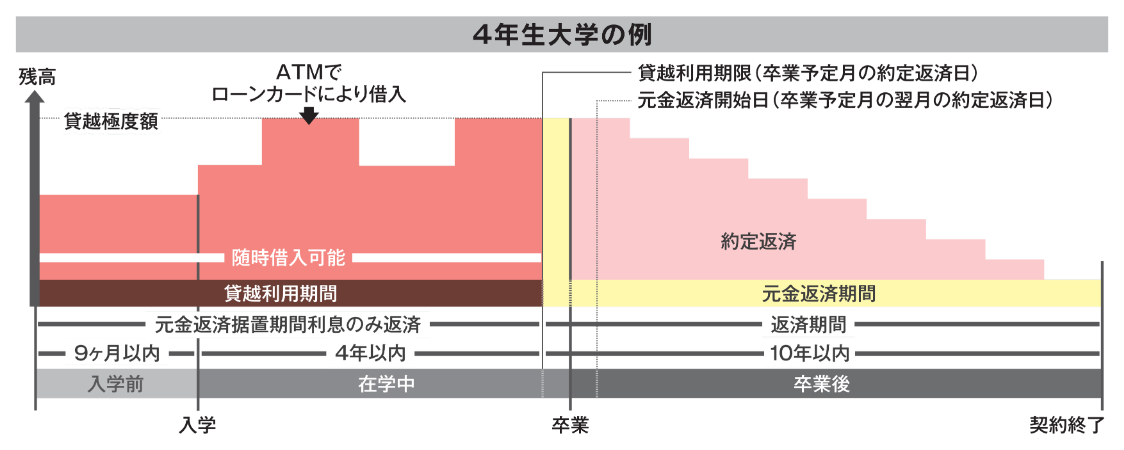 入学の9か月前から卒業予定月の10日まで、カードローンとして繰り返しご利用いただけます。